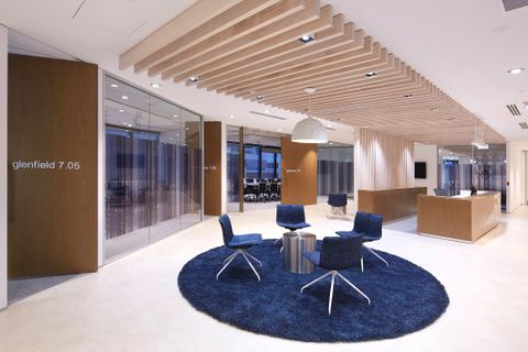 Eine junge, dynamische Marketing-Umgebung, die bestehende Räume neu nutzt, mit Fokus auf einen repräsentativen Empfangsbereich, einer TV-Wand mit personalisierten Begrüßungen für Gäste, einem hochwertigen Besprechungsraum und integrierter Kunst, die vom Projektteam des Kunden entwickelt wurde.